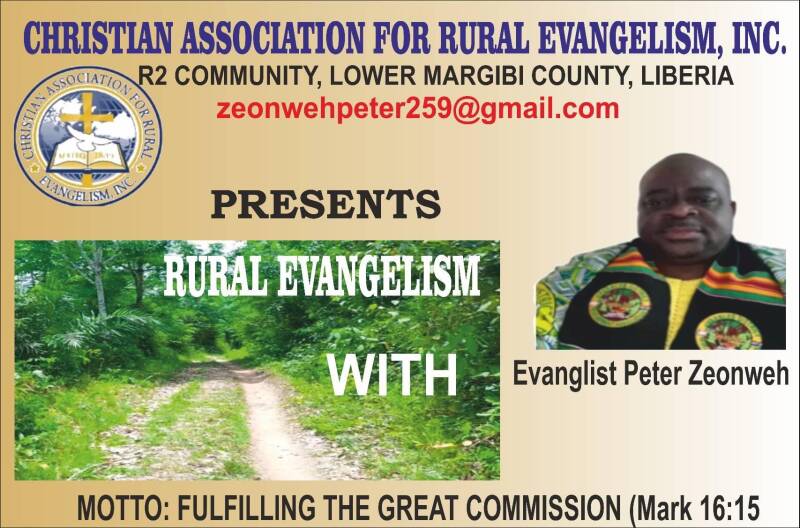 Hello everyone, welcome to Christian Association for Rural Evangelism. Our mandate on every platform is to gear our communities as a whole into the rich words of God. We are established in West Africa, Liberia and also right here in Providence Rhode Island. I am the Pastor/founder of all of our branches here and in the rural areas. My name is Pastor Peter Zeonweh. Please contact us for prayers, volunteer work or helping the poor in our rural communities. You are again welcome
